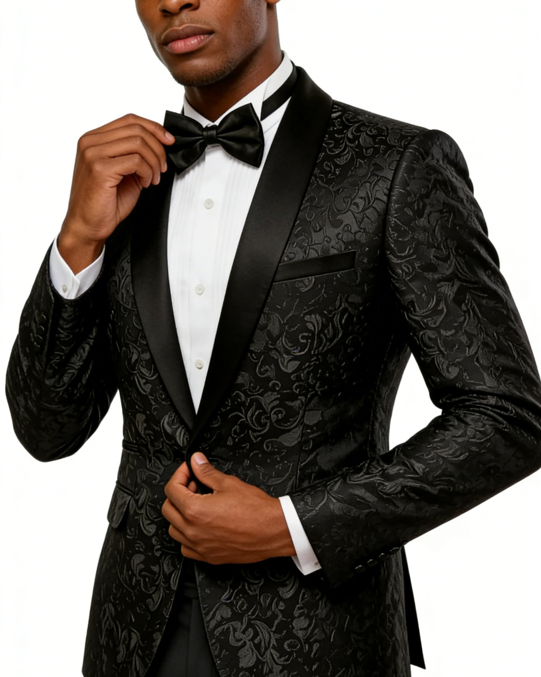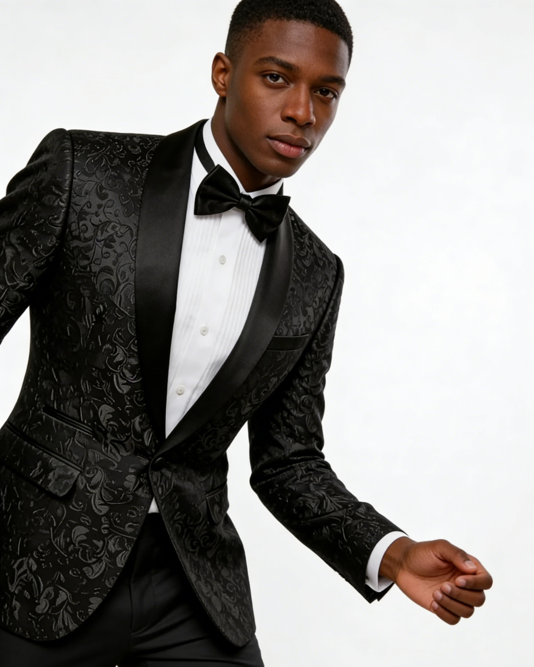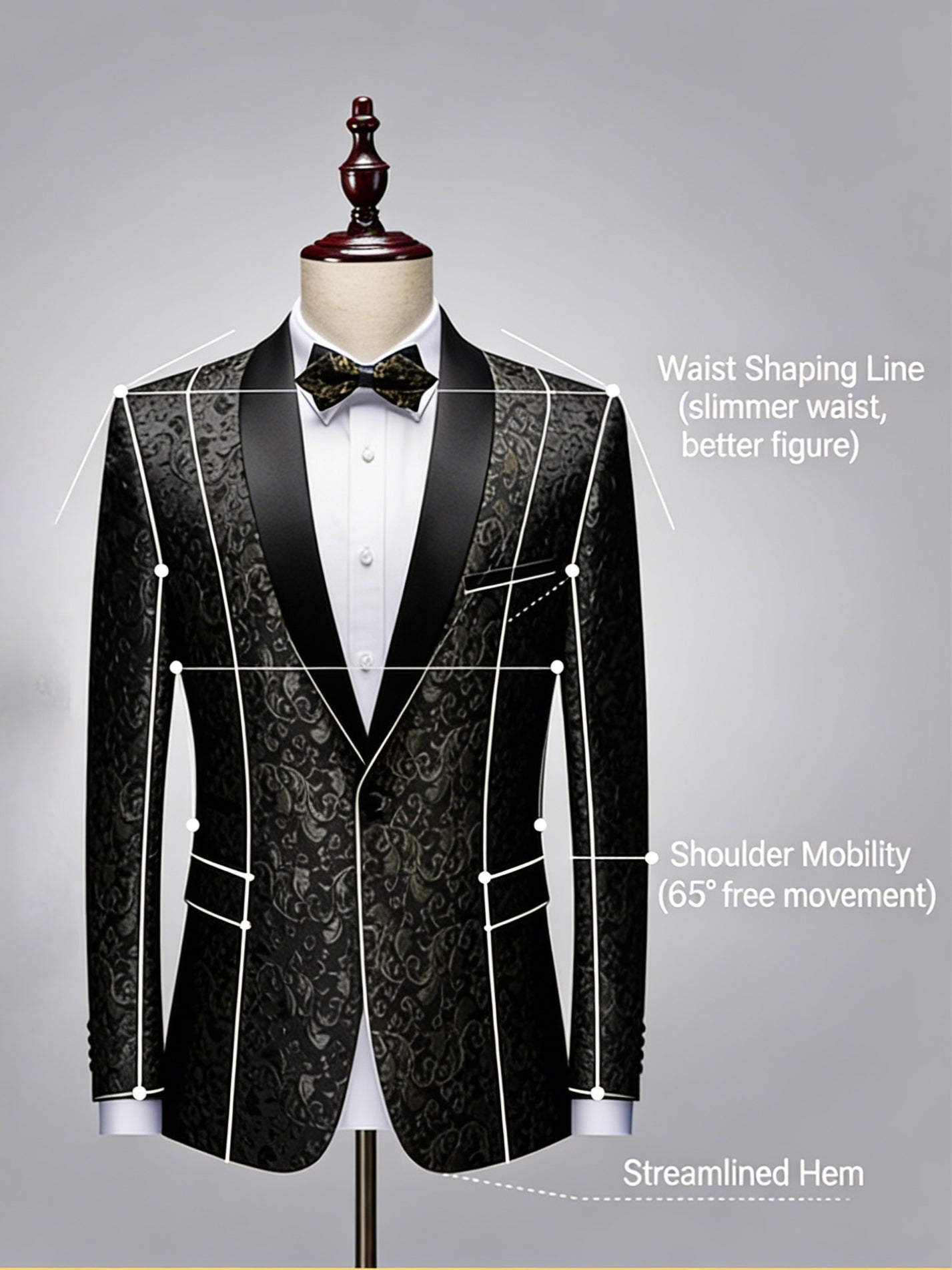 The main color is classic solid black, matched with paisley jacquard embroidery with three-dimensional and delicate lines, low-key and textured,eye-catching but not exaggerated, breaking the dullness of solid black formal wear; the satin shawl lapel and jacquard fabric form a textural color contrast layering, which is more high-end under the light; the black color system is not picky about skin tones and highly photogenic, meeting the visual styling needs of European and American social check-in, Prom, red carpet and other formal occasions.
