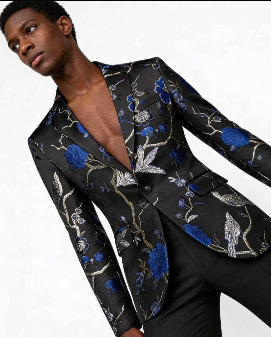 Men's Blue 2-Piece Birdsong Forest Embroidery Notched Lapel Formal Prom Suit